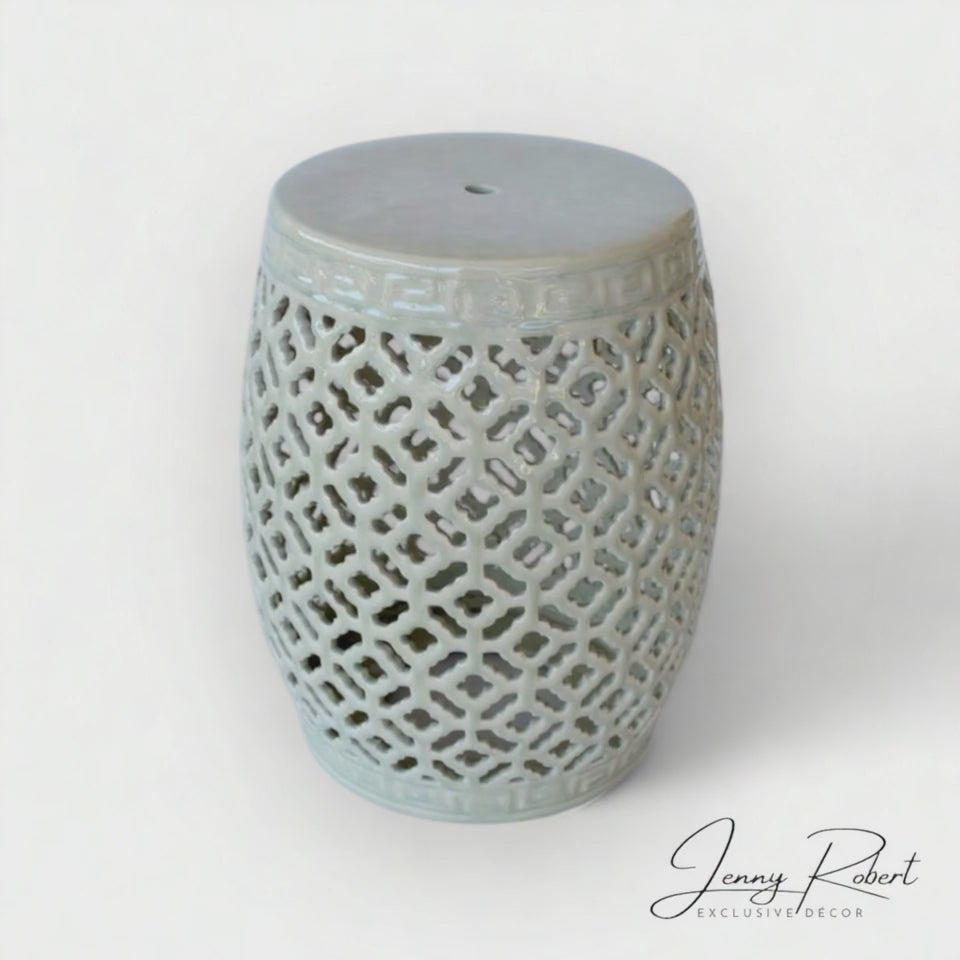 This elegant sage ceramic stool features an intricate cut-out lattice design, finished with a subtle crackle effect and a high-gloss glaze. Its versatile style makes it perfect as extra seating, a side table, or a decorative accent, adding a touch of sophistication and texture to any indoor or outdoor space.