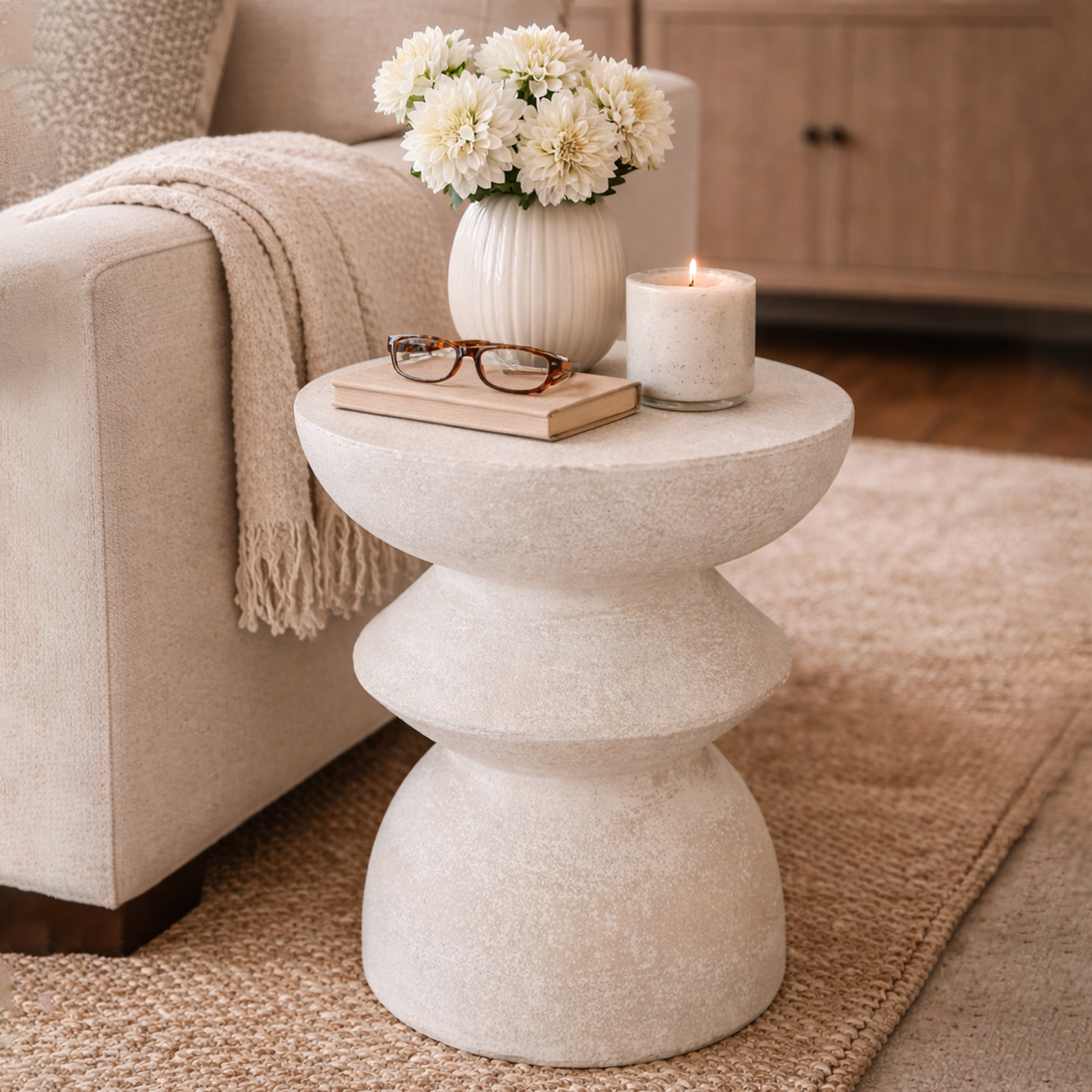 A sculptural stool or side table in a textured bone finish, featuring a soft stone-like surface and curved geometric form. Perfect as an accent piece beside a sofa or bed, adding natural elegance to any space
