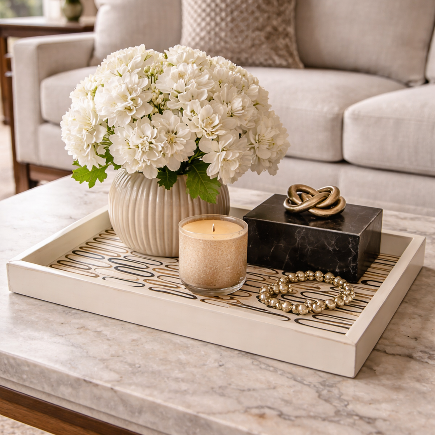 Cream Vanity tray with a circular patterned design made from resin and horn.