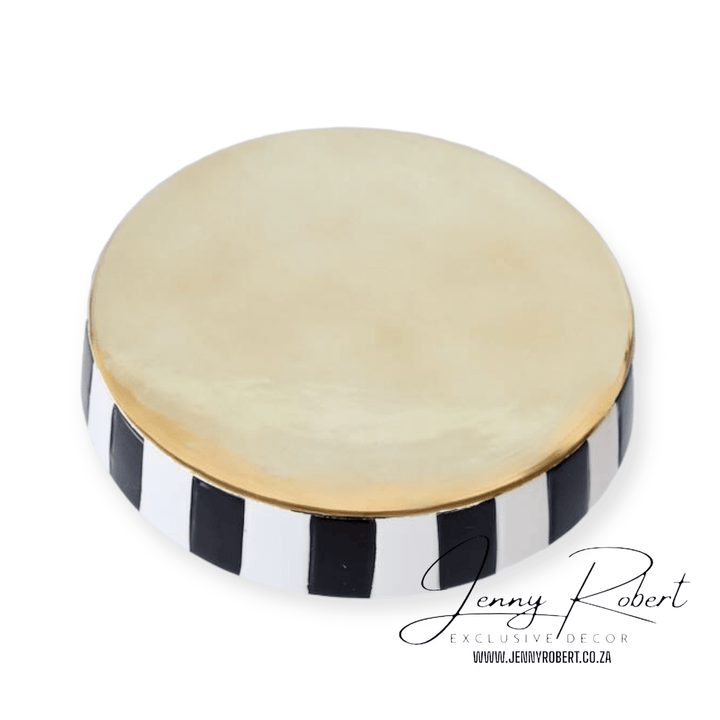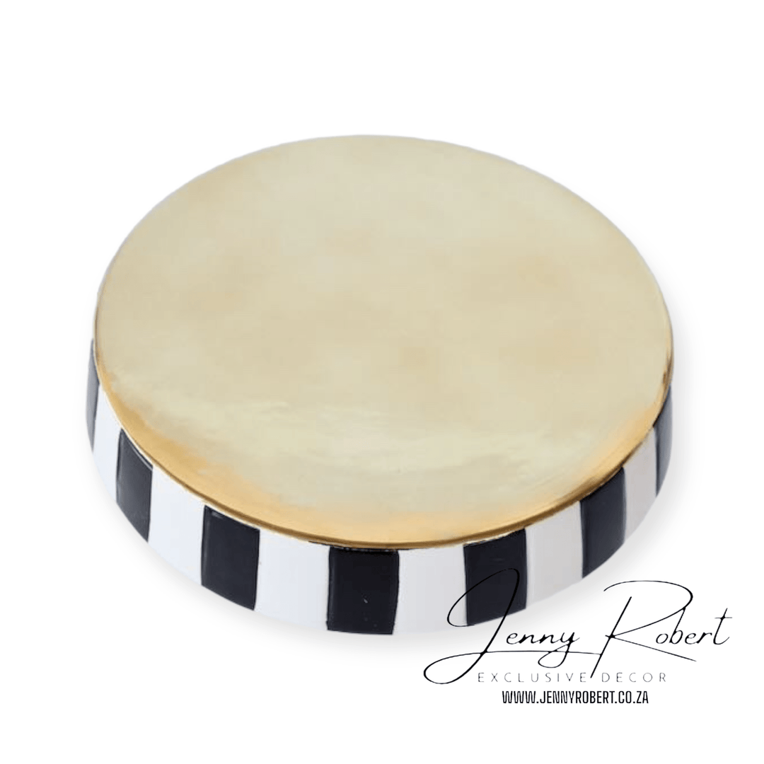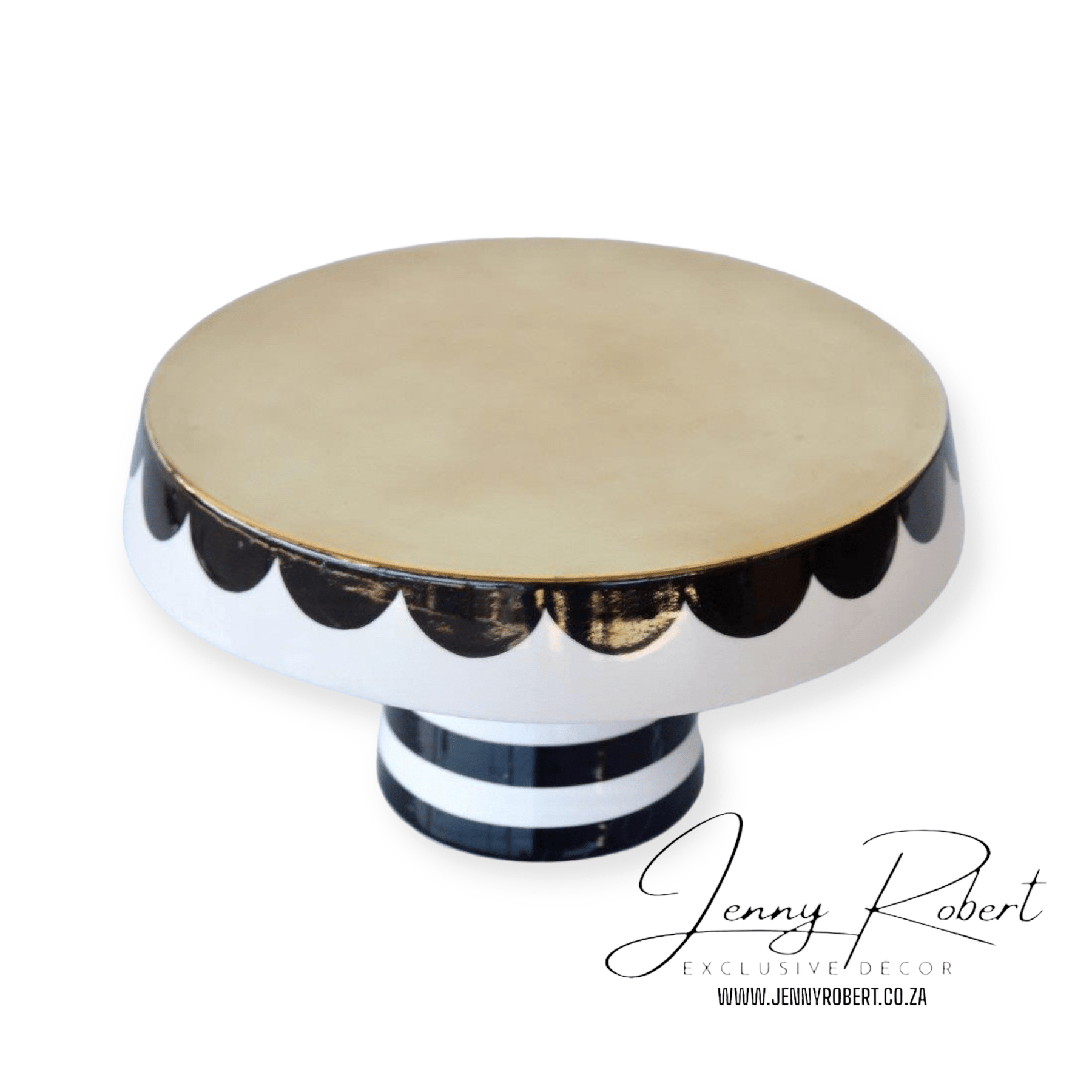 Lovely circular ceramic tray mounted on a stem feature an elegant black and white scalloped striped design, complemented by a stunning gold finish on the top.
