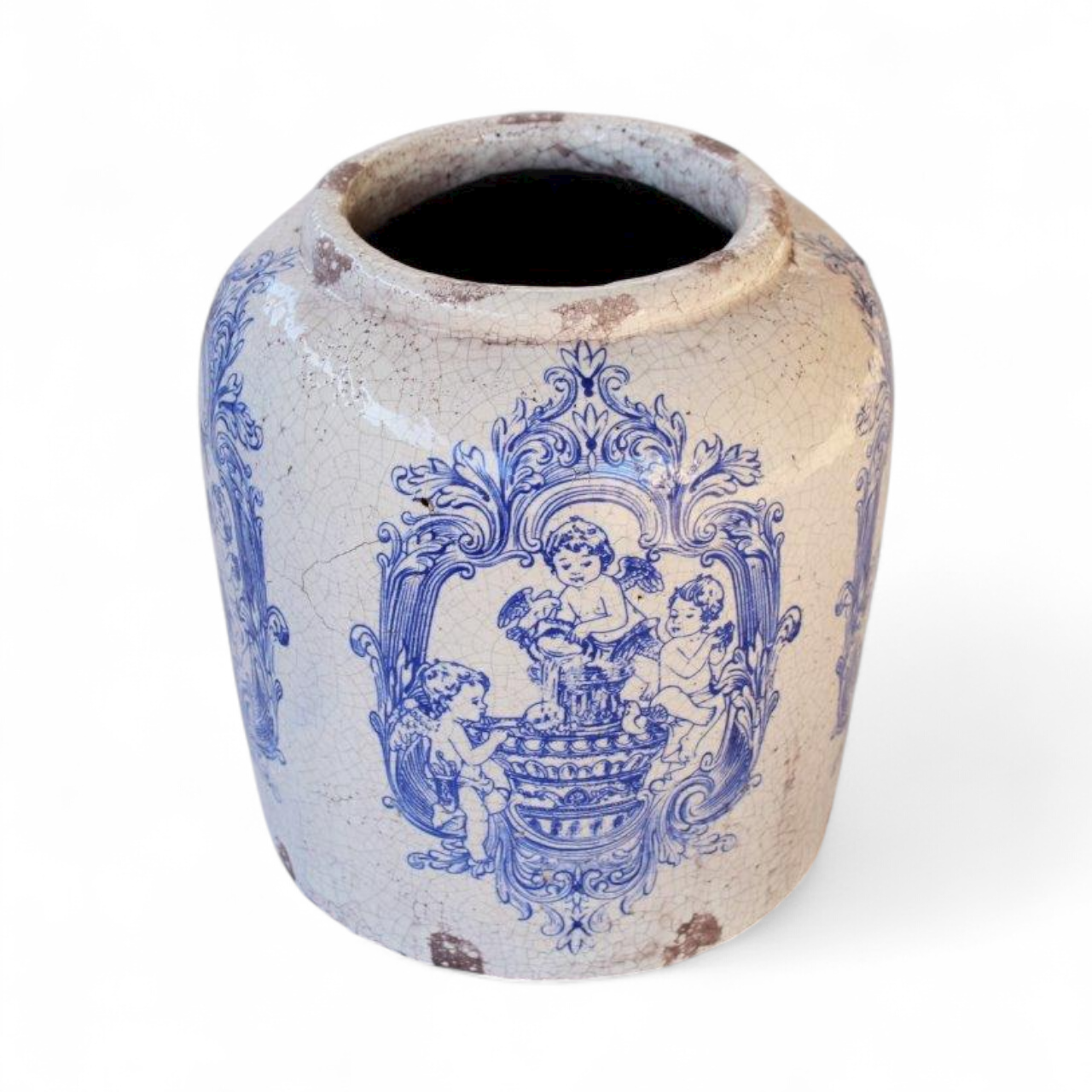 Rustic Blue and off white distressed Planter in a crackled glaze finish with an Angel design.