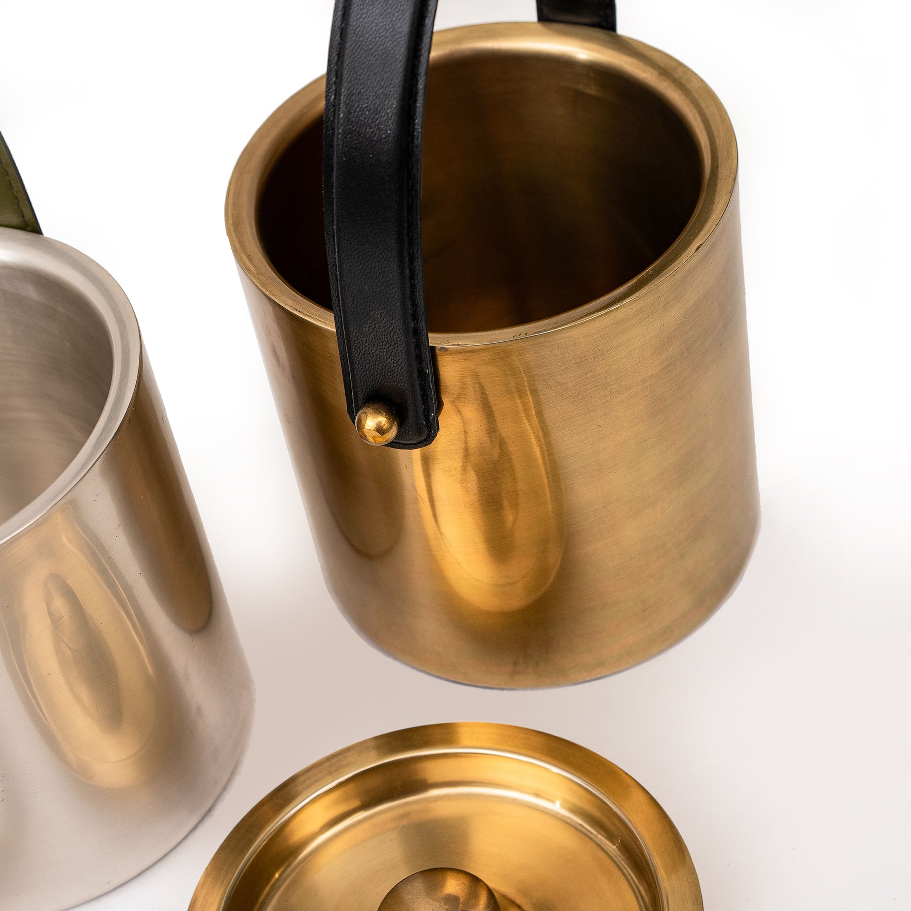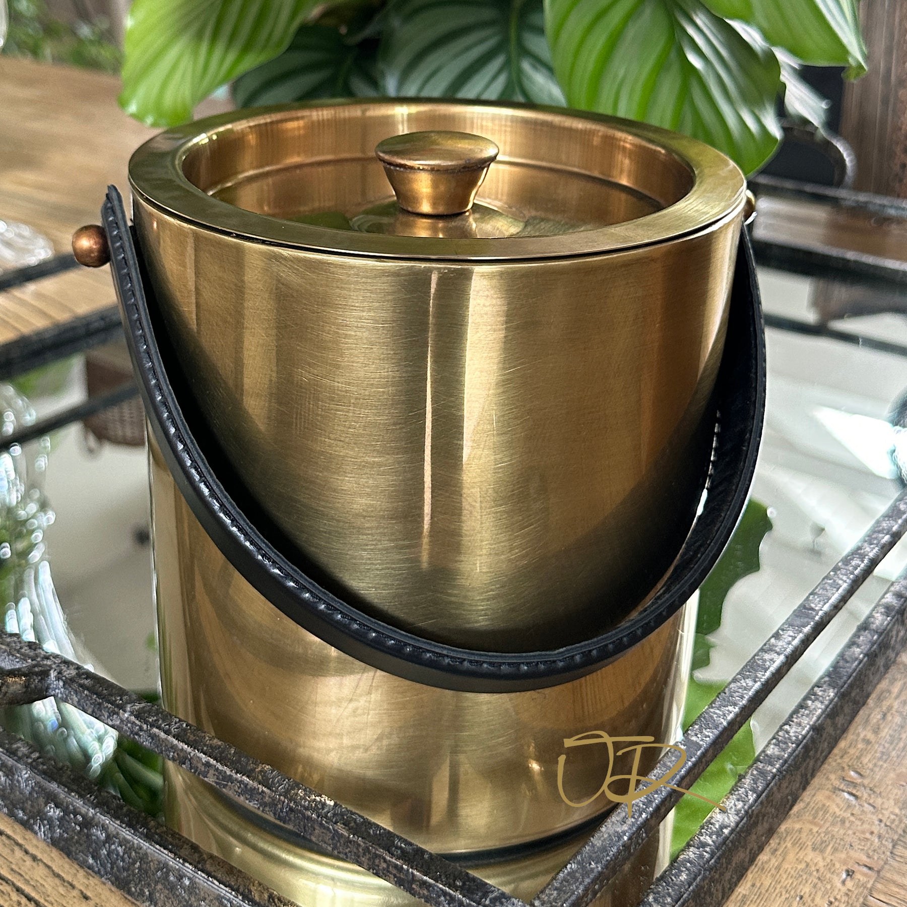 Beautiful Brushed Brass or Pewter Ice bucket with inner lining & leather handle