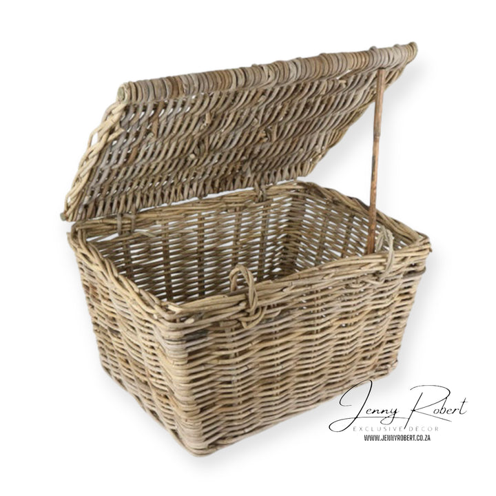 A traditional and charming picnic basket made from thick woven rattan material. Rectangular in shape, with a hinged lid and a handle on top for easy carrying.